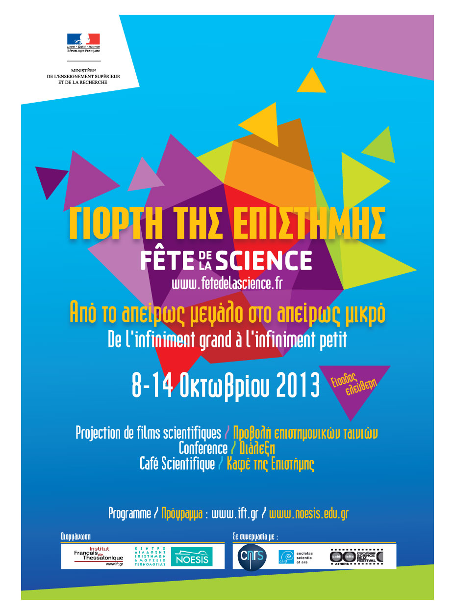 Στο πλαίσιο του φετινού εορτασμού, με κεντρικό θέμα "Από το απείρως μεγάλο στο απείρως μικρό" (De l'infiniment grand l'infiniment petit), το Γαλλικό Ινστιτούτο Θεσσαλονίκης συμμετέχει ενεργά με τη διοργάνωση σχετικών εκδηλώσεων από κοινού με το ΝΟΗΣΙΣ, που θα πραγματοποιηθούν την εβδομάδα 8 - 14 Οκτωβρίου 2013, στις εγκαταστάσεις και των δύο φορέων.