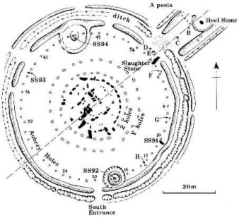 Σχέδιο του Stonehenge με τους Λάκκους Aubrey, τη Λίθο του Θυσιαστηρίου, τη Λίθο της Φτέρνας και τους Τέσσερις Σταθμούς 91,92,93,94 (από το βιβλίο του Rodney Castleden The Making of Stonehenge. London and New York: Routledge, 1993. σ. 30)