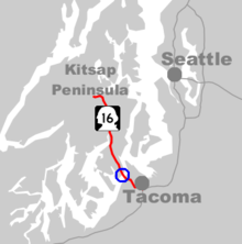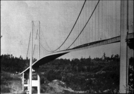 Η πρώτη γέφυρα στα στενά της Tacoma κατασκευάσθηκε το 1940 και συνέδεε την πόλη Tacoma με την χερσόνησο Kitsap της Πολιτείας Ουάσινγκτον των Ηνωμένων Πολιτειών. Ήταν μια κρεμαστή γέφυρα, μήκους 1.810 μέτρων και πλάτους 12 μέτρων (πολύ στενή), η οποία δόθηκε σε κυκλοφορία την 1η Ιουλίου 1940 Η γέφυρα κατέρρευσε στις 7 Νοεμβρίου του ιδίου έτους στα νερά του Puget Sound, μιας θαλάσσιας λωρίδας του Ειρηνικού Ωκεανού στην στεριά.