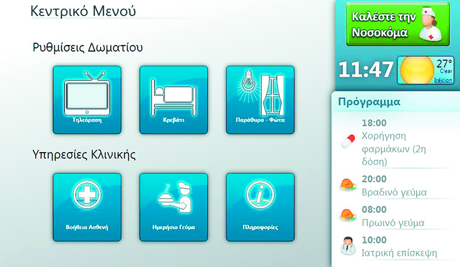 Στην τηλεόραση που υπάρχει στο δωμάτιο εμφανίζεται μια εφαρμογή που περιέχει μετρήσεις πραγματικού χρόνου και προηγούμενες αποθηκευμένες, όπως καρδιογραφήματα, μετρήσεις της συστολικής και της διαστολικής πίεσης, των παλμών της καρδιάς, των ποσοστών οξυγόνου, του βάρους του ασθενούς, καθώς και γενικές πληροφορίες όπως η ηλικία, ή ακόμη και οι αλλεργίες που έχει και τα τρόφιμα που πρέπει να αποφεύγει. Η ίδια εφαρμογή παρουσιάζεται στον υπολογιστή αφής που υπάρχει στον χώρο και πλέον χρησιμοποιείται από τον γιατρό. Ολες οι ιατρικές μετρήσεις που λαμβάνονται μέσα από ασύρματες συσκευές πιστοποιημένες για ιατρικούς σκοπούς αποθηκεύονται στο κεντρικό σύστημα. Τα δεδομένα μπορούν να διαμοιραστούν με άλλους χώρους, όπως είναι το γραφείο του γιατρού ή ένα άλλο νοσοκομείο που μπορεί να βρίσκεται κάπου αλλού. Ενα επιπρόσθετο πλεονέκτημα του συστήματος είναι ότι μπορεί εύκολα να επεκταθεί για να καλύψει μελλοντικές ανάγκες, ενώ παρέχει και τη δυνατότητα της προσαρμοστικότητας των διεπαφών για άτομα με προβλήματα όρασης, κινητικά προβλήματα κ.ά.» υπογραμμίζει ο κ. Καρτάκης.