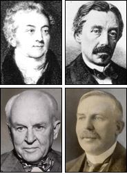 Με τη φορά του ρολογιού από επάνω αριστερά: Ο Thomas Young, Ο Jean-Bernard-Leon Foucault, Ο Ernest Rutherford και ο Robert Millikan.