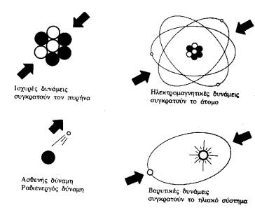 Σχήμα 2 - Οι τέσσερις θεμελιώδεις δυνάμεις της Φύσης που θέλει να ενοποιήσει η σύγχρονη Φυσική.