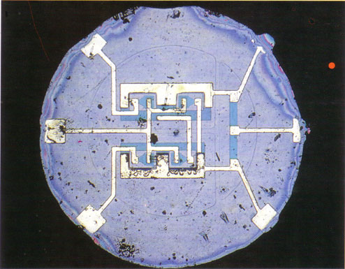 Λευκές συνδέσεις από αλουμίνιο σε σχήμα αράχνης συνδέουν γαλάζια τρανζίστορ με σχήμα κώνου σε ένα μικροσκοπικό ολοκληρωμένο κύκλωμα σχεδιασμένο για την εκτέλεση λογικών πράξεων σ'ένα υπολογιστή. Τα τσιπ-όπως αυτό - που εικονίζεται μεγενθυμένο περίπου 60 φορές (η κόκκινη κουκίδα δείχνει το πραγματικό μέγεθος)-κατασκευάστηκαν για πρώτη φορά σε μαζική παραγωγή με την επαναστατική επίπεδη μέθοδο στις αρχές της δεκαετίας του '60.